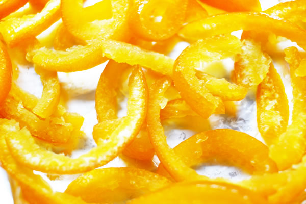 搾汁後の柑橘果皮をダイスカット、縦長カットの2種類をピールとしてご準備しております。
